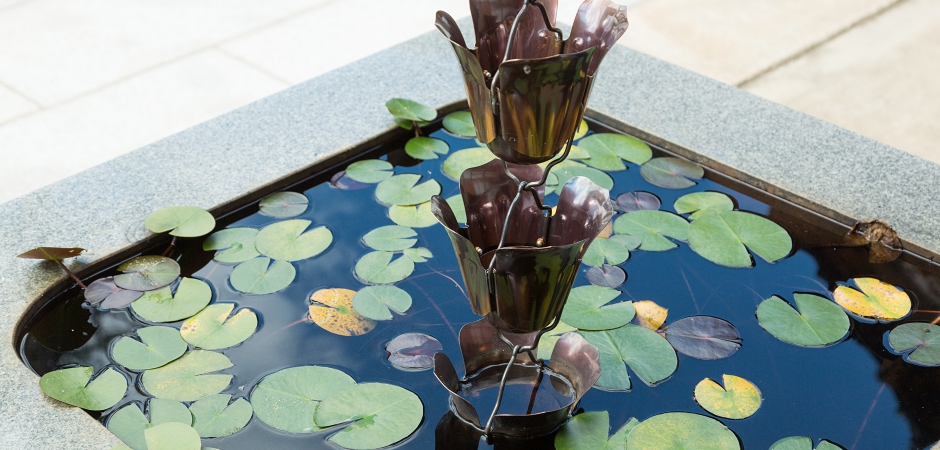 空に向かって雨を求める花をイメージした和風の鎖樋