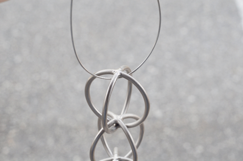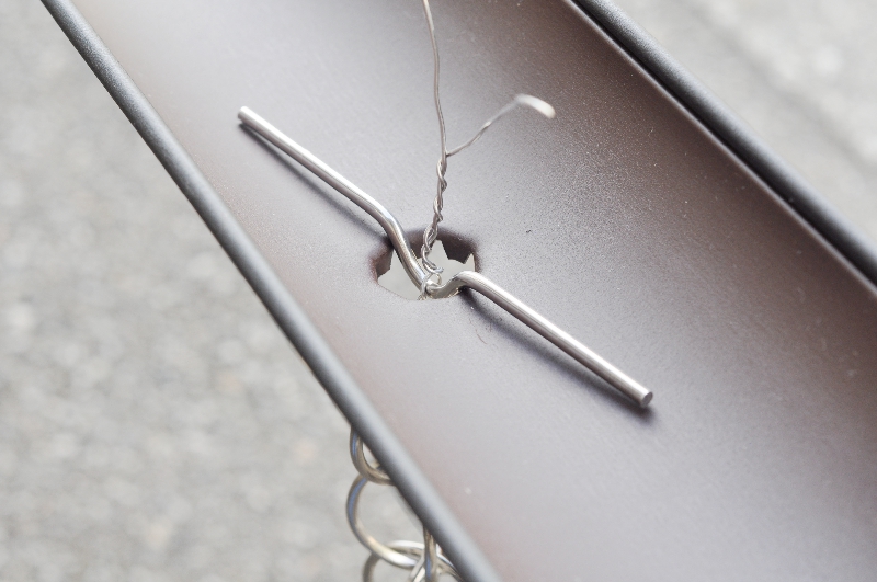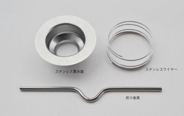 標準で製品と同梱されている取付金具は3つになります。 ステンレス製のφ4mmの線で作られている長さ140mmの吊り金具と、同じくステンレス製1mmの針金約1m,ステンレス集水器です。