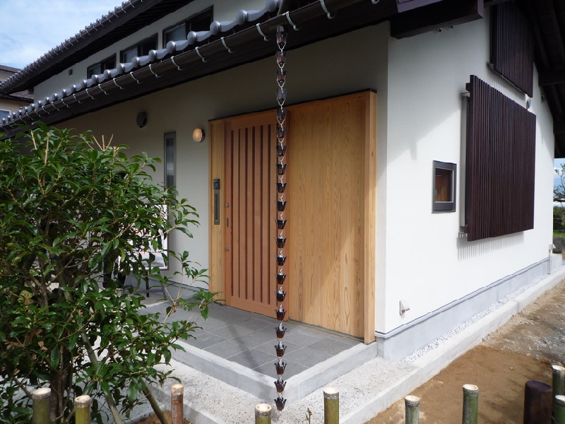 シンプルな形の住宅に鎖樋がアクセントになっています。