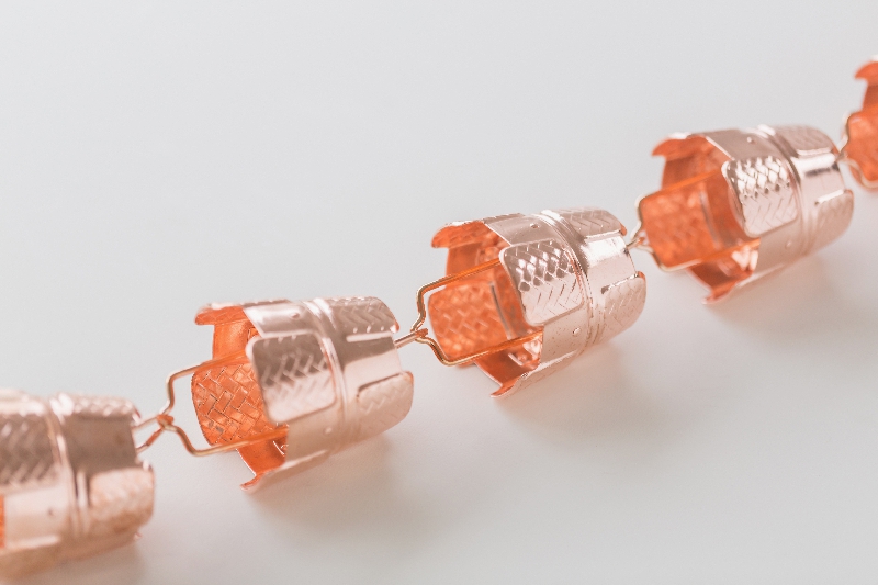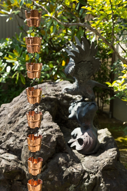 銅はその経年変化の美しさと耐久性から、古くから寺院の屋根や飾り、雨樋に利用されてきました。網代はすべて純銅製のため、銅本来の輝きから、すこしずつ落ち着いた褐色に変わり、数十年の年月を経て、緑青と呼ばれる奥深い緑色に変化していきます。時間の経過と共に美しく変わり続ける無塗装の純銅鎖樋の味わいをお楽しみください。
