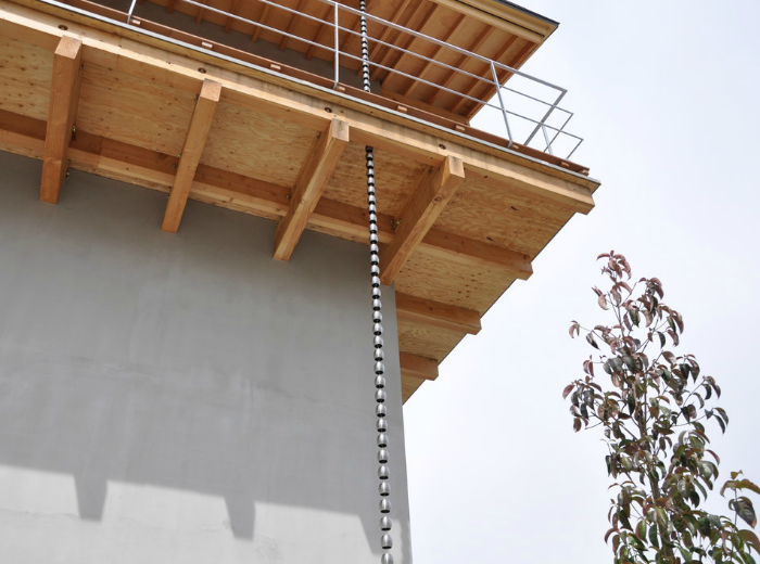玉のようなコロンとした柔らかな丸いフォルムが印象的なステンレス製の鎖樋です。雨水が優しく伝い流れることにより、玉の柔らかなイメージをさらに引き立たせます。波紋のようなリングタイプの鎖樋の雰囲気を持ちながらも、雨水を綺麗に整えながら地面まで美しく導くことができます。表面は光沢感が抑えられたヘアーラインにクリアーのセラミック塗料をコーティングし、高級感を高めています。